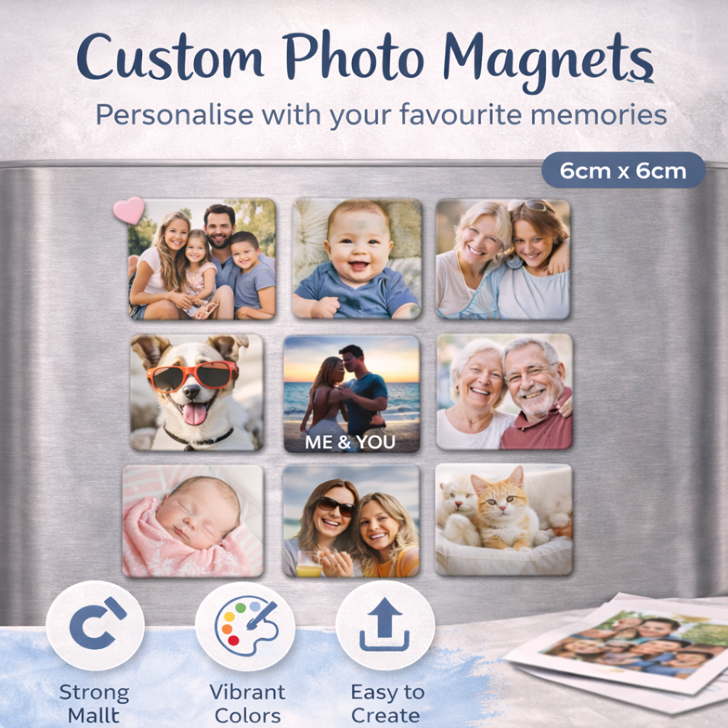 Bring your memories to life with our premium 6x6 cm personalised photo magnets. Whether it’s a family photo, your partner, your baby, your pet or a special celebration, we transform your favourite pictures into high-quality magnetic keepsakes that you can proudly display on your fridge.